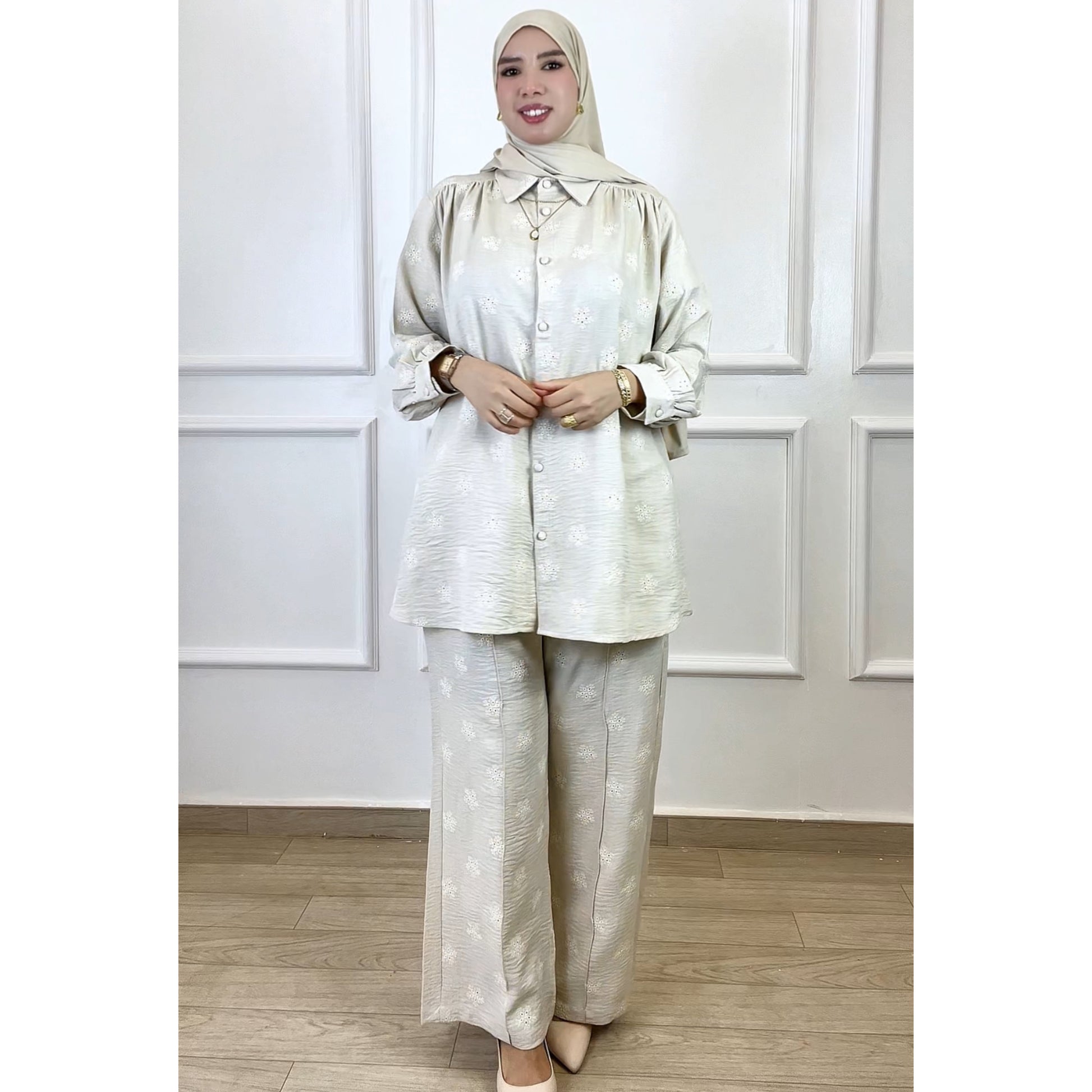 Cet ensemble en lin deux pièces est parfait pour un look à la fois chic et décontracté. Confectionné dans un tissu en lin demi-saison, il est idéal pour les journées douces du printemps et de l'automne. La chemise à manches longues et le pantalon large assorti sont ornés d'un délicat motif floral blanc, ajoutant une touche de fraîcheur et de féminité.