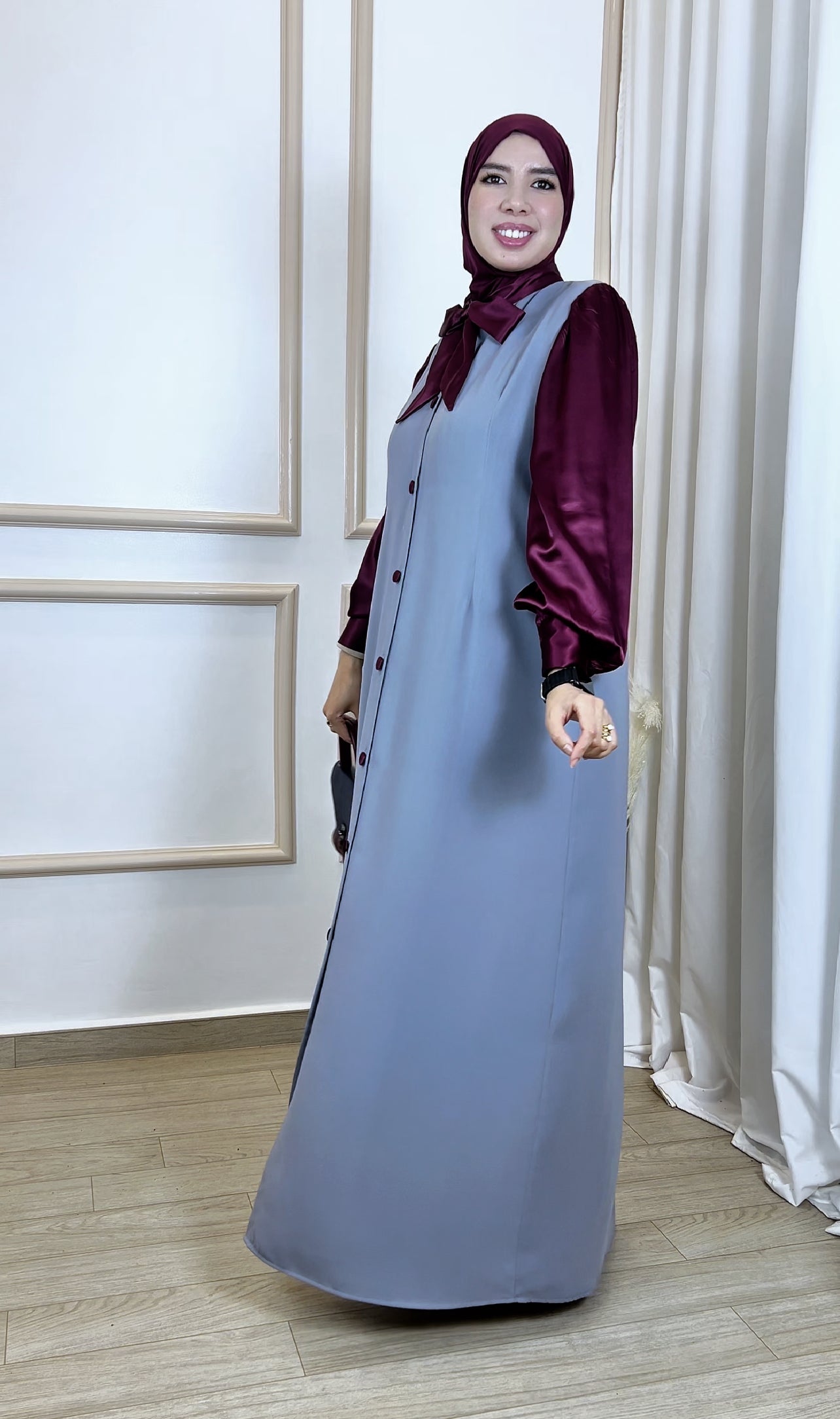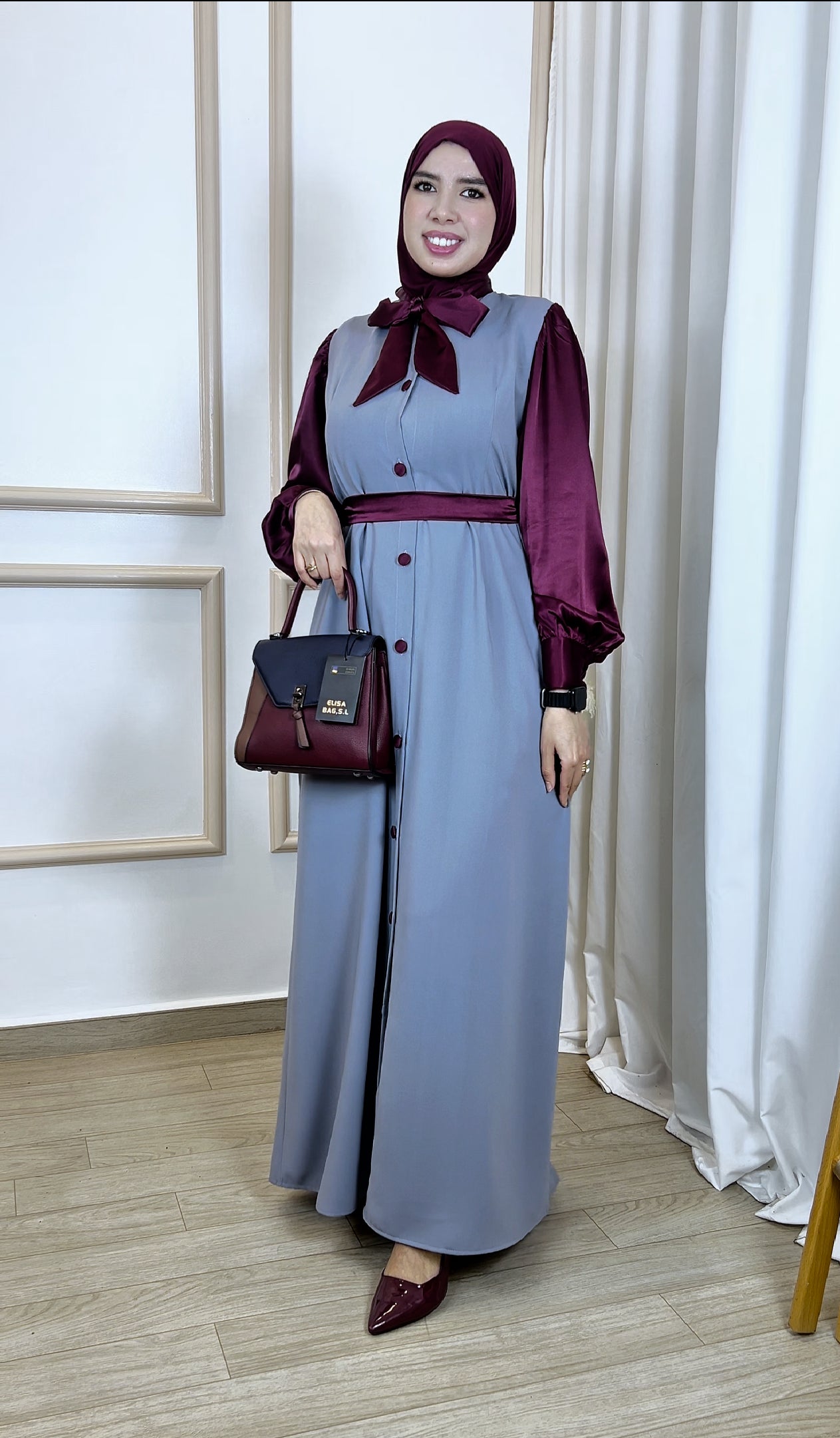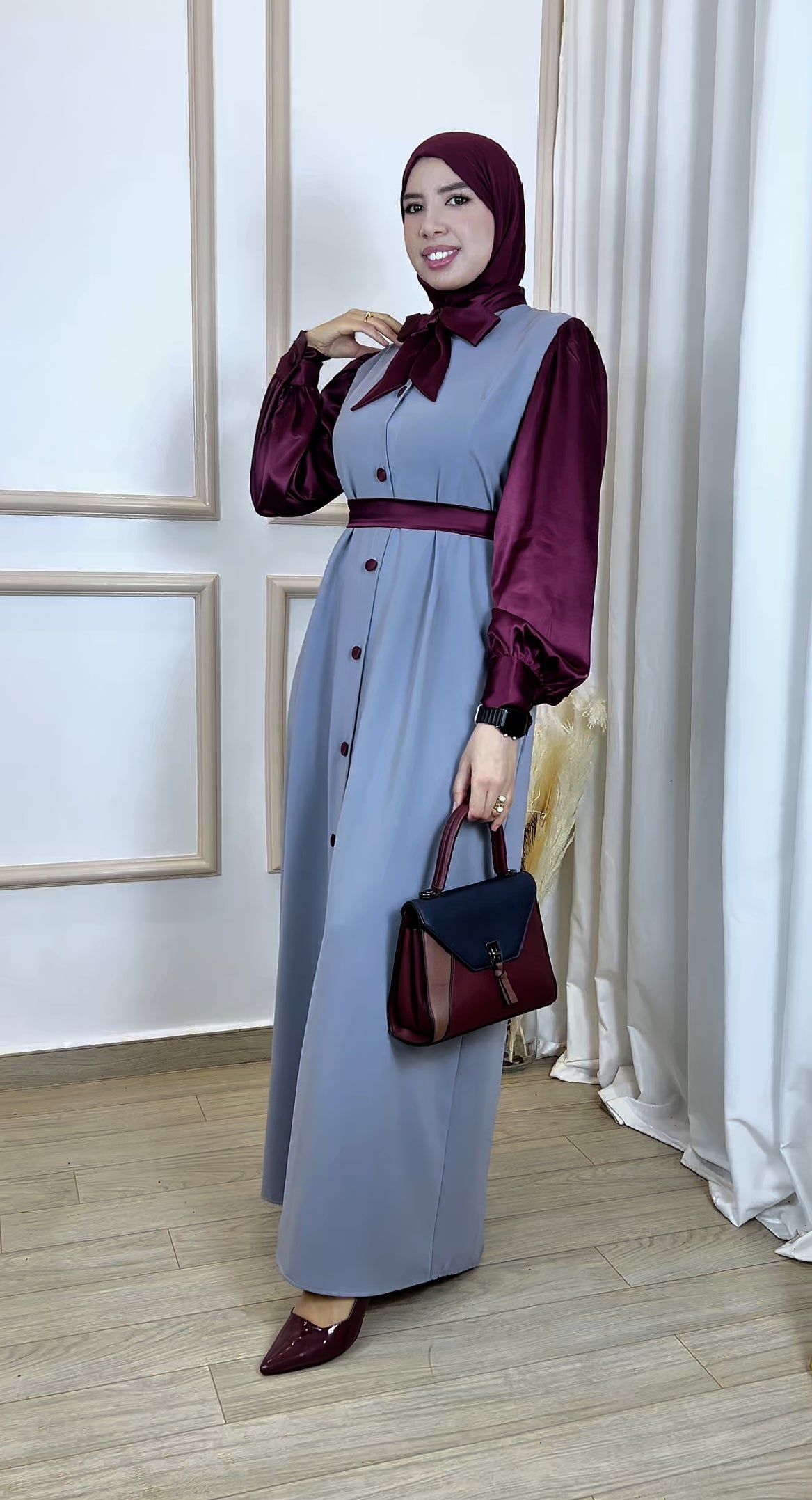 Optez pour un look chic et raffiné avec cette robe longue fluide. Son tissu gris doux est sublimé par des manches satinées bordeaux et un col noué élégant. La coupe boutonnée et la ceinture assortie soulignent la silhouette avec finesse.