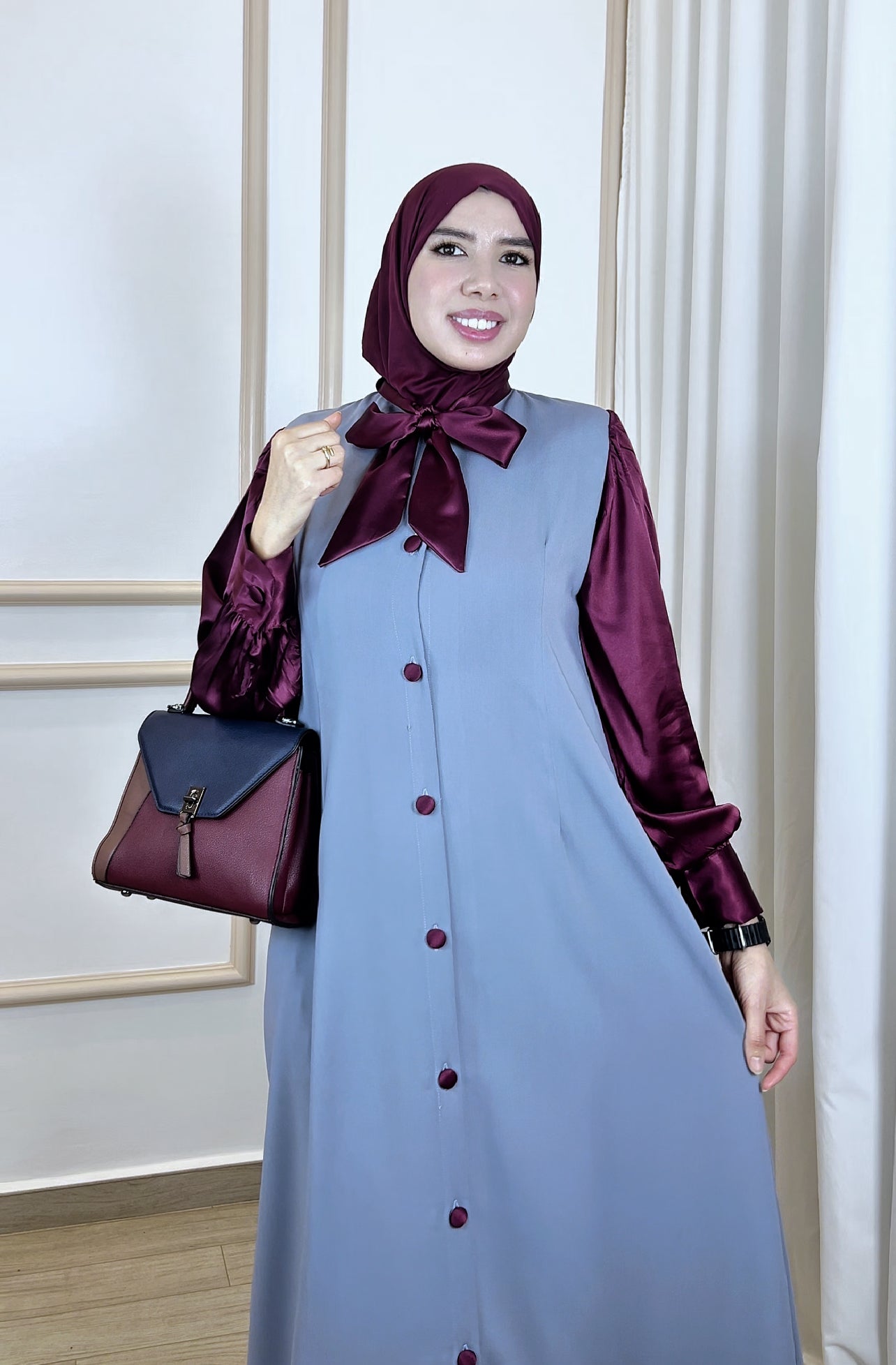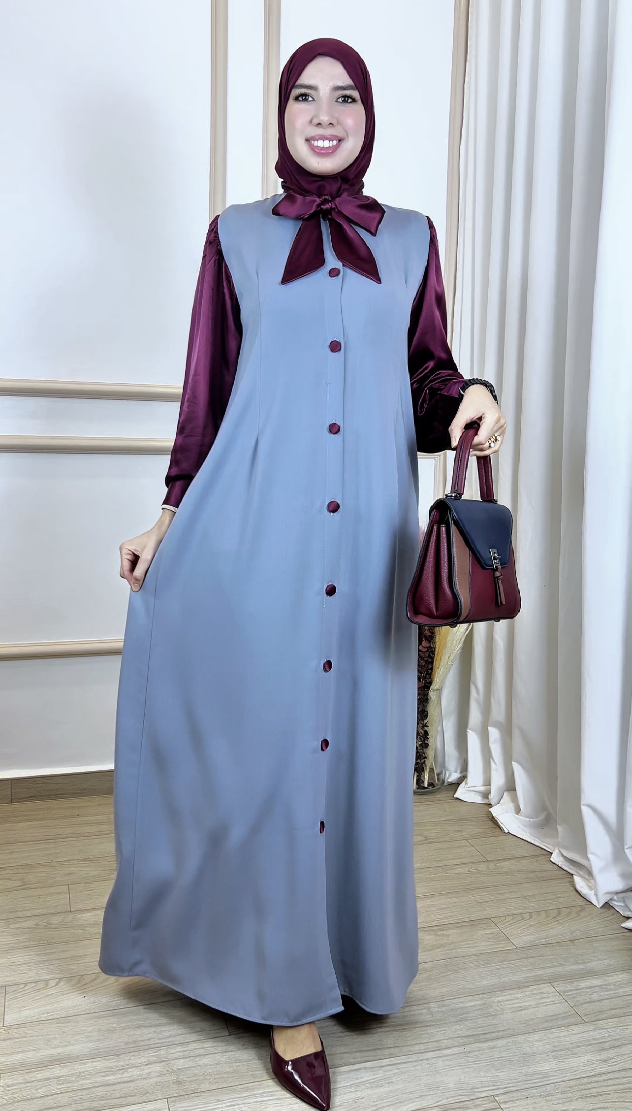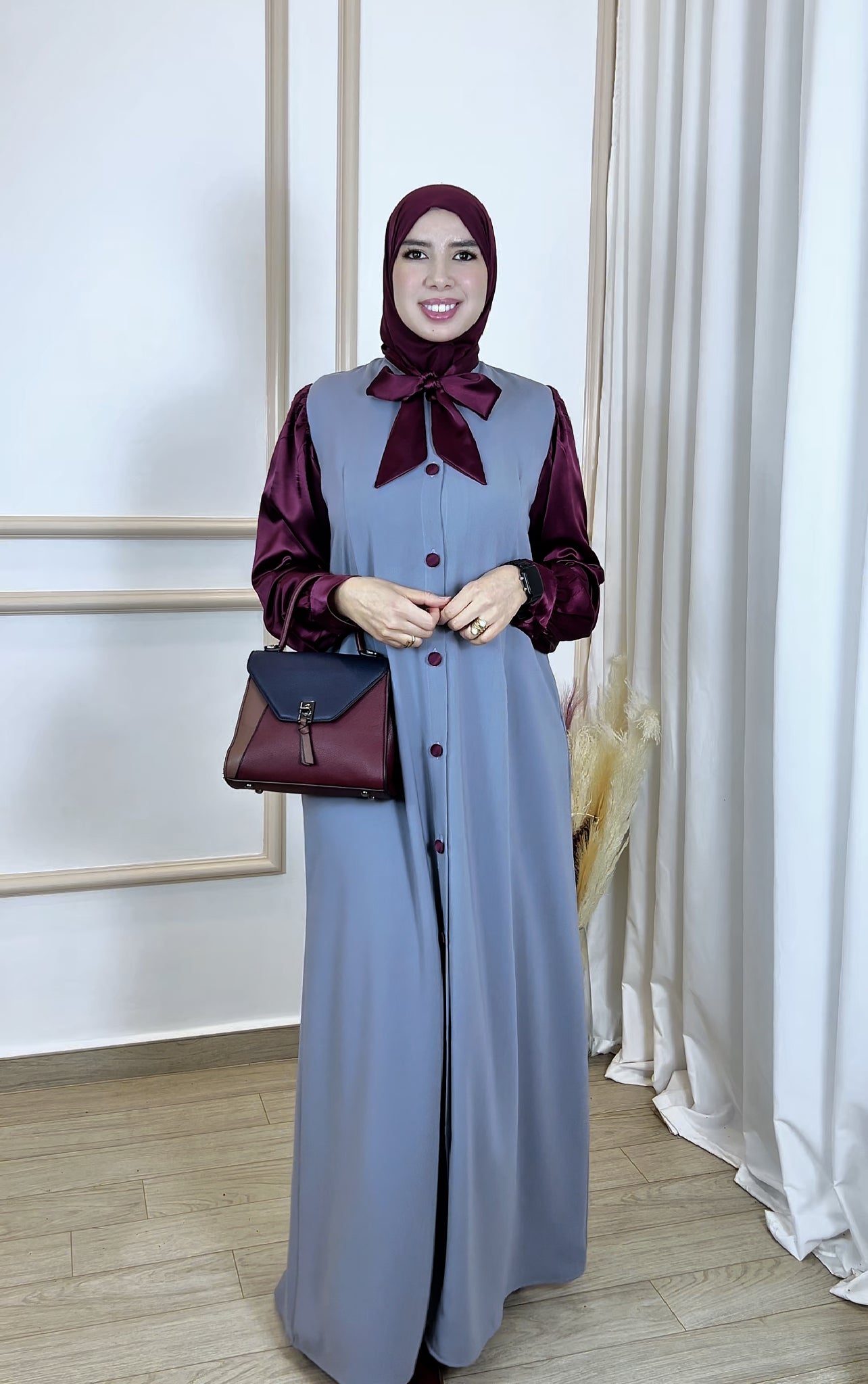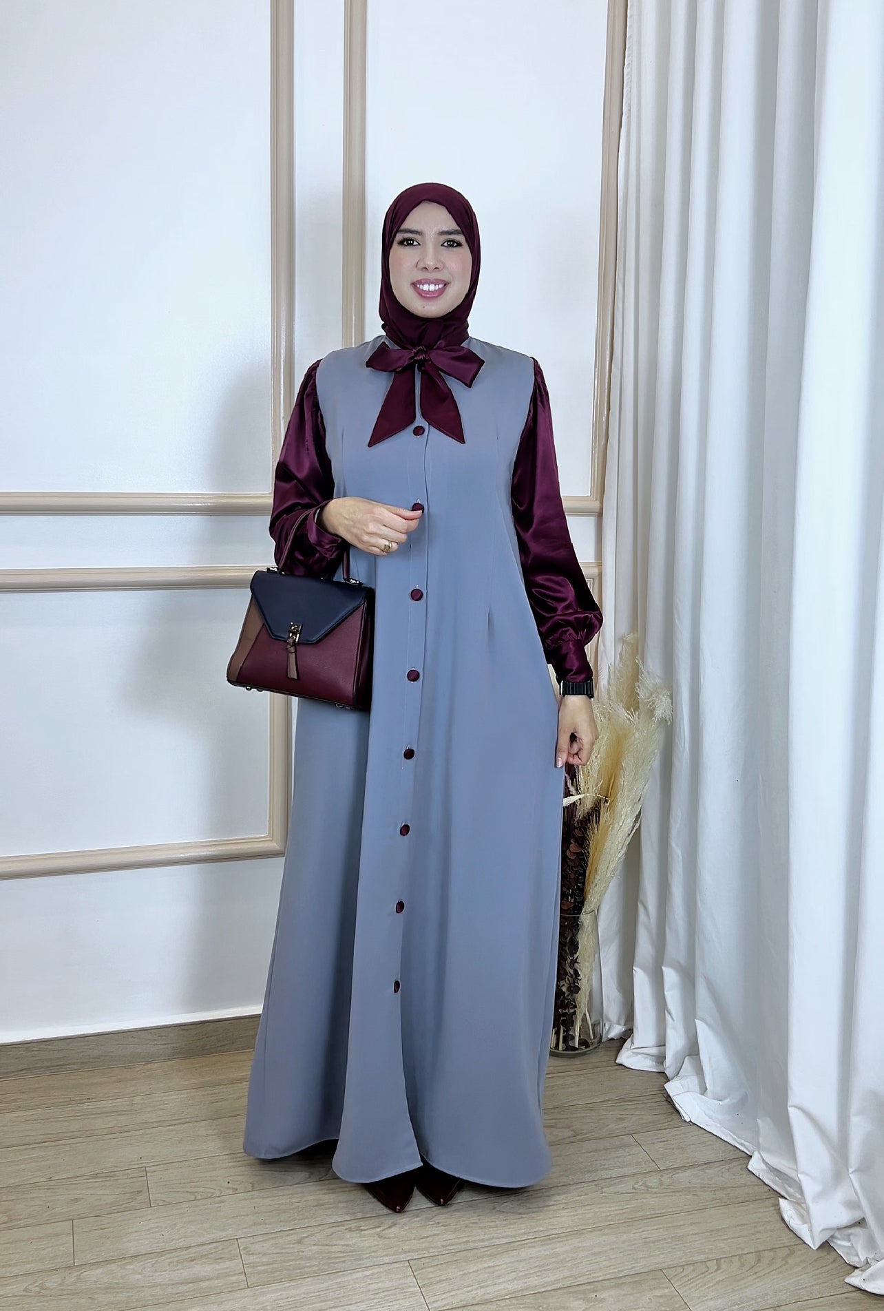 Optez pour un look chic et raffiné avec cette robe longue fluide. Son tissu gris doux est sublimé par des manches satinées bordeaux et un col noué élégant. La coupe boutonnée et la ceinture assortie soulignent la silhouette avec finesse.